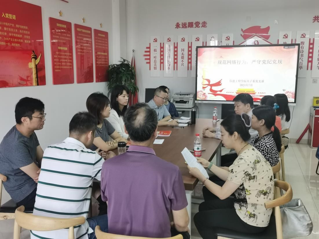 信息工程学院电子系党支部开展“规范网络行为,严守党纪党规”主题党日活动 为进一步引导党员领导干部自觉遵守网络法律法规,在网络行为中坚持正确政治方向,积极主动宣传党的理论和路线方针政策,2024年7月4日,电子系党支部开展“规范党员网络行为,营造清朗网络环境”主题党日活动。活动由电子系党支部书记李怡同志主持。 全体教师党员一起诵读了《中国共产党党员网络行为规定》,明确了要坚持正确政治方向、舆论导向、价值取向,严守政治纪律和政治规矩,发挥先锋模范作用,走好网上群众路线,营造健康向上、...