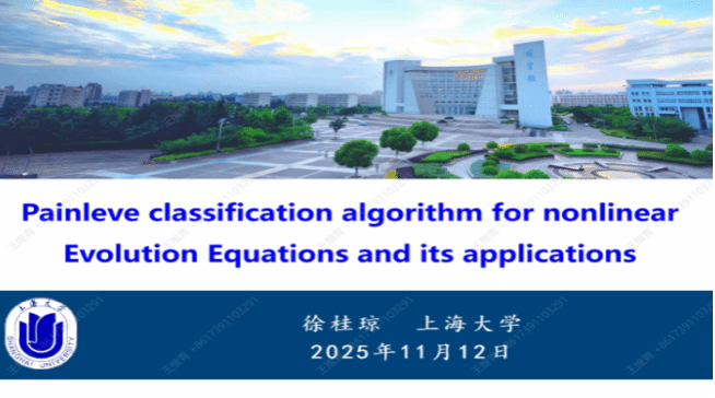 上海大学徐桂琼教授应邀为我院师生作报告 11月12日,应信息工程学院微分方程与机器学习创新团队邀请,上海大学教授、博士生导师徐桂琼,通过腾讯会议,为我院师生作了题为 “Painlevé Classification Algorithm for Nonlinear Evolution Equations and Its Applications” 的学术报告,报告由微分方程与机器学习创新团队负责人夏亚荣教授主持。 徐教授长期深耕于孤立子与可积系统、数学机械化、复杂网络、智能信息处理等领域的研究,主持完成3项国家自然科学基金、多项省部级项目,...