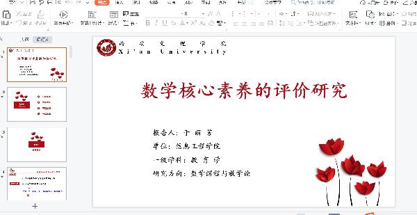 1月13日晚,数学系承办了学院博士论坛线上学术交流会。数学与应用数学专业于丽芳博士在腾讯会议作了一场题为《数学核心素养的评价》的线上学术报告。学院副院长李向军、数学系全体教师及学院其他相关老师在线聆听了整场报告。