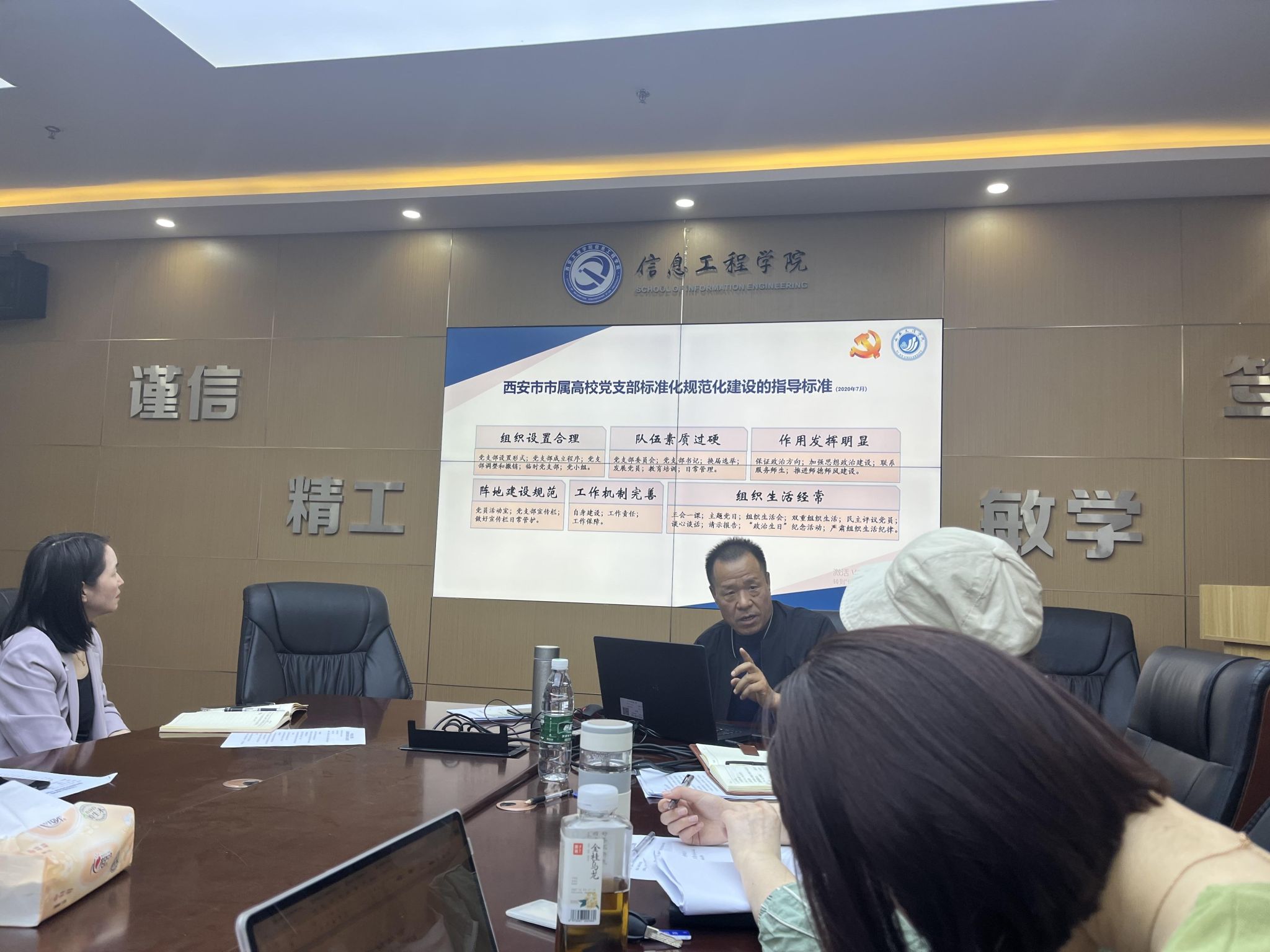 2024年4月25日,电子系党支部支委参加信息工程学院党总支扩大会议,围绕党支部标准化规范化建设及“双创”工作深化学习研讨。会上,离退休处党总支组织员张智敏作《坚守“标准”,做好“双创”》专题报告,系统阐释新时代党支部建设核心要求与实践路径。