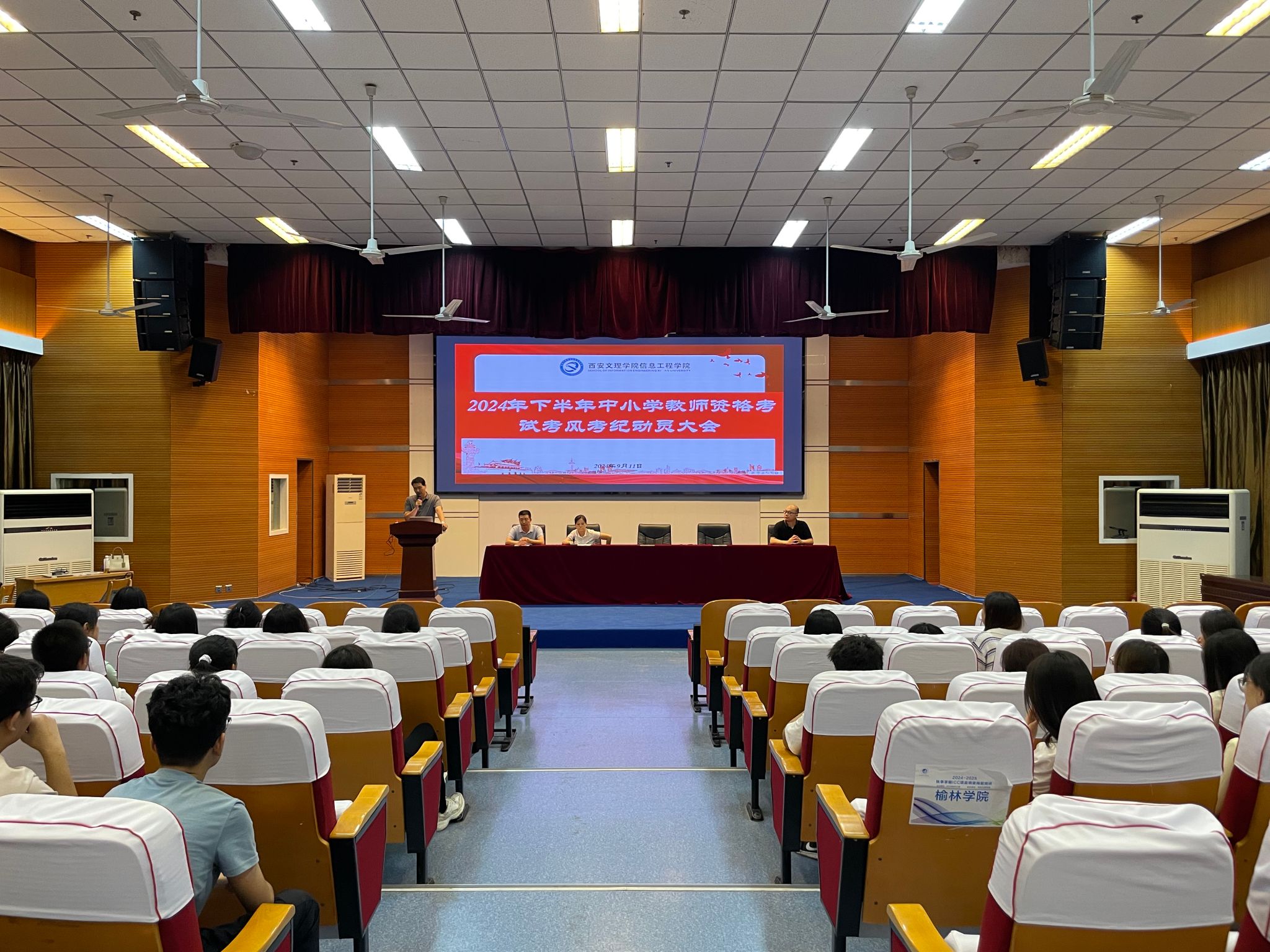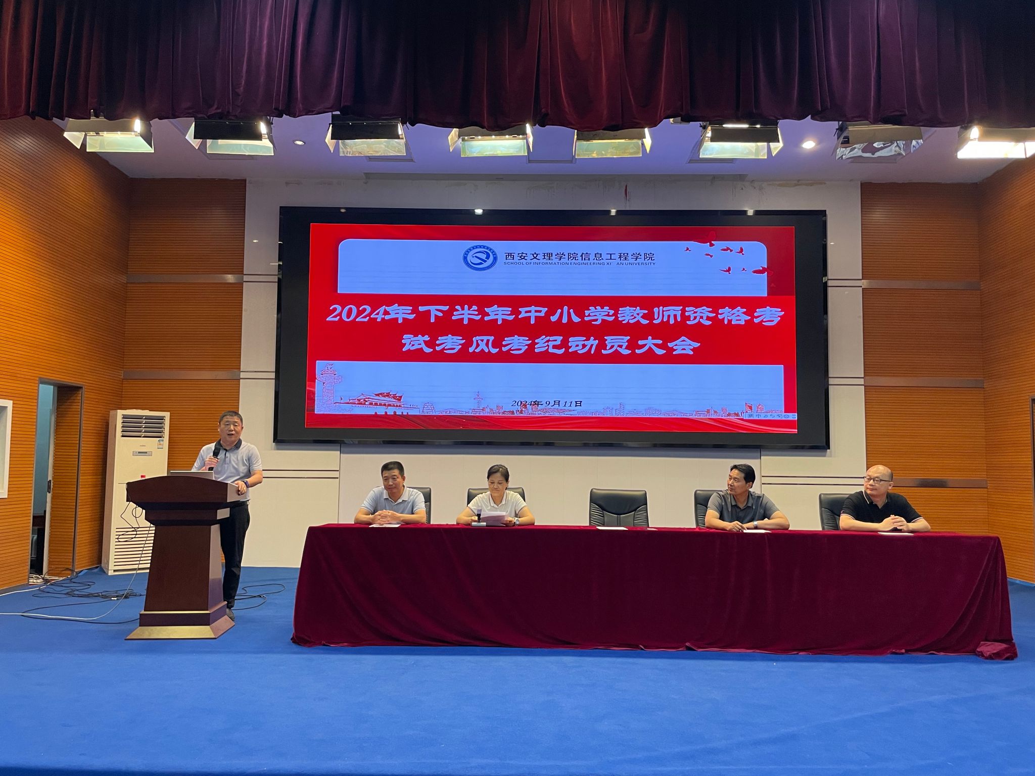 为了强化考生的纪律意识,弘扬诚信精神,进一步推进学院独具匠“信”学风建设之考风考纪建设,营造公平、公正、诚信的考试环境,2024年9月11日18:30信息工程学院在明德楼A区报告厅召开了“2024年下半年中小学教师资格证考试”考风考纪动员大会。参加本次会议的有信息工程学院党总支书记王向阳,教学副院长陈广锋,党总支书副记许萌,数学系主任王宇副教授,数学与应用数学专业教研室主任陈寅博士,各带班辅导员老师及21级、22级203名考生。本次会议由辅导员老师任绒主持。