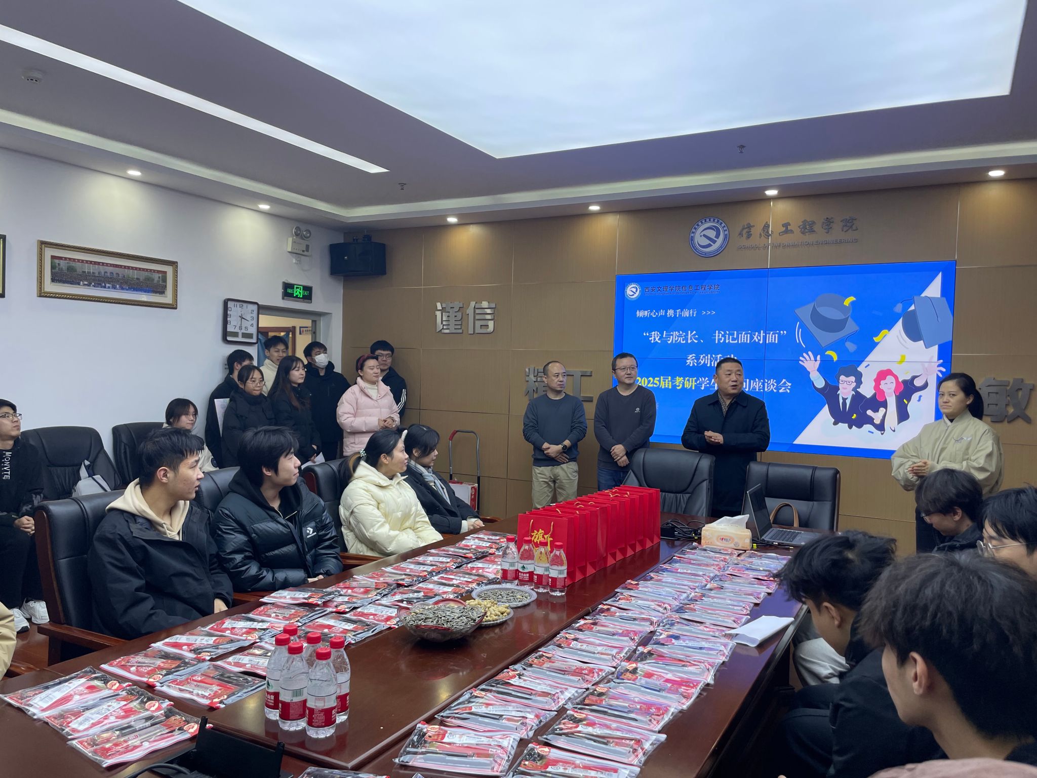 为了关心和支持即将参加2025年研究生入学考试的学子们,2024年12月20日,学院举办了“我与院长、书记面对面”系列活动之25届考研学子慰问座谈会。倾听考研学子的心声,为他们提供心理调适、学习方法及未来规划等方面的指导与帮助,同时也为他们送上学院的温暖与鼓励。参加本次会议的有:信息工程学院党总支书记王向阳,科研副院长冯永亮教授,副院长雷磊博士,党总支副书记许萌,学工办负责人姚力萍,毕业班辅导员及全体25届考研学生。本次会议由信息工程学院党总支副书记许萌主持。