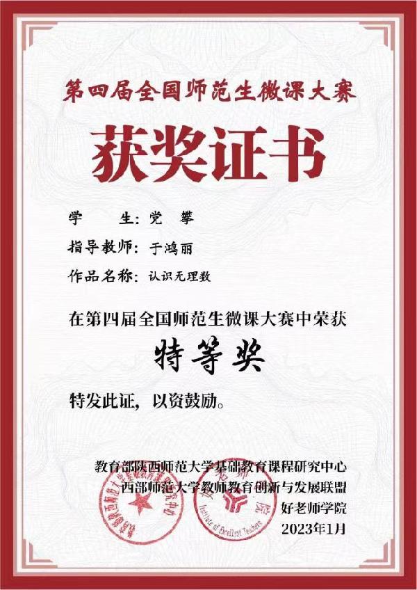 第四届全国师范生微课大赛已落下帷幕,信息工程学院数学与应用数学专业学生党攀的作品《认识无理数》,在于鸿丽教授悉心指导下,经过层层选拔,喜获特等奖,于鸿丽被评为优秀指导教师,同时学生李妍的作品《探索勾股定理》获得二等奖,指导教师为于丽芳博士。