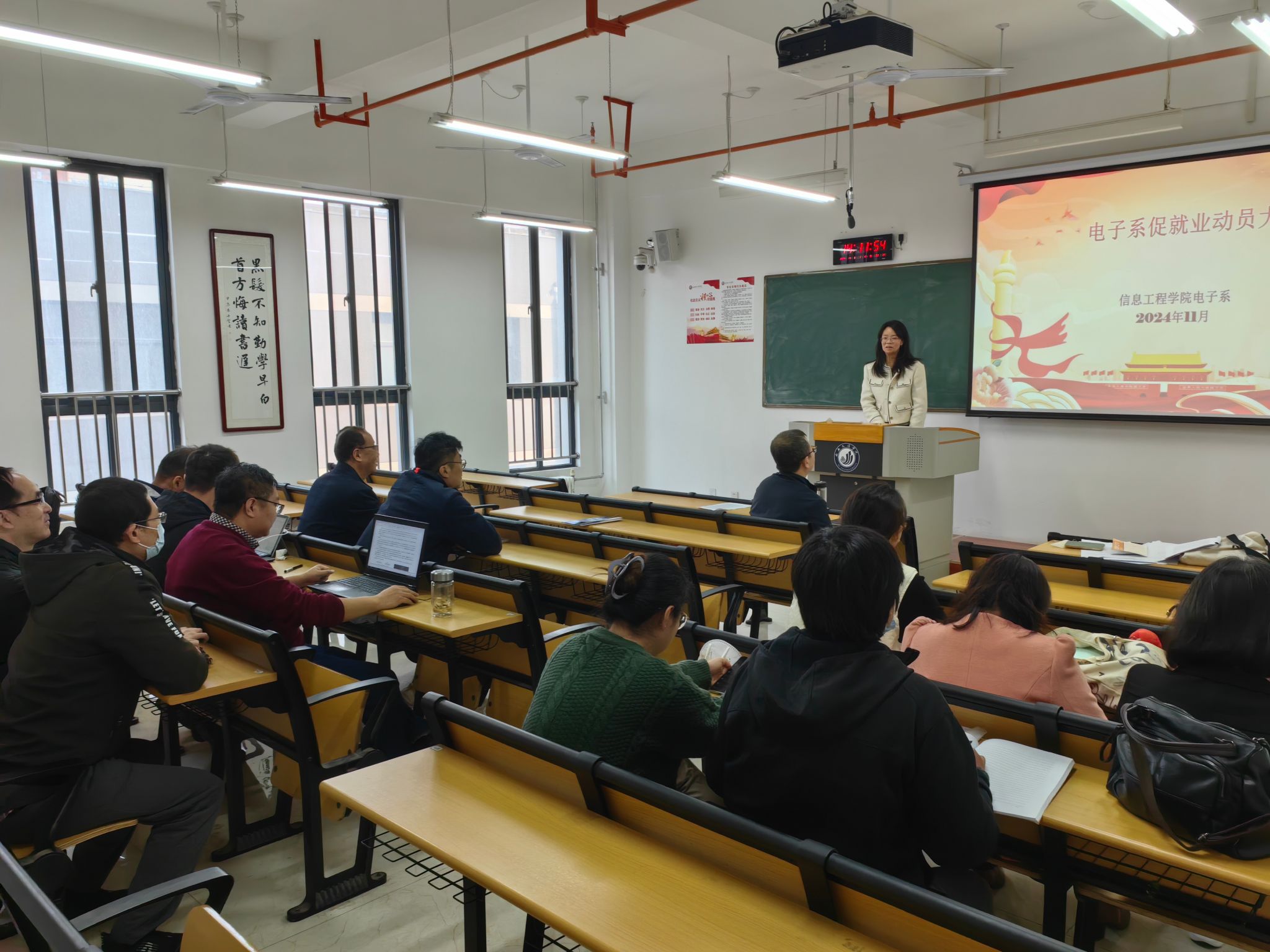 2024年11月6日中午,信息工程学院电子工程系党支部与电子系在行知楼S521联合举办了2025届毕业生就业工作推进会。参加本次会议的有:科研副院长、党总支宣传委员冯永亮,电子系主任、党支部书记李怡,辅导员毕冉及电子系全体教师。本次会议由李怡主持。