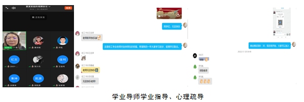学业导师开展线上指导,关心、关爱学生。疫情期间学生的心理也不容忽视,每位指导教师都与自己的学业指导学生通过微信、钉钉、电话等进行了交流和沟通,对学生从思想上进行关心和疏导。