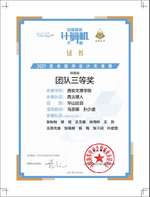 5月6日,2021年“中国高校计算机大赛-团体程序设计天梯赛”全国总决赛结果揭晓。我校信息工程学院代表队获得“华山论剑”组陕西省团队三等奖,此次比赛填补了我院该竞赛获奖的空白,为今后该项目竞赛奠定了基础。