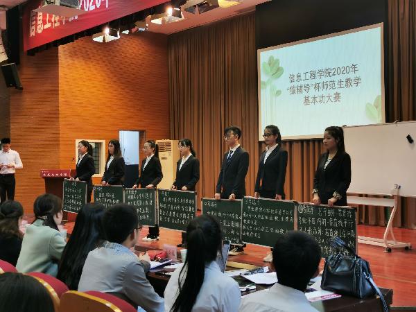 信息工程学院师范生基本功大赛包括三笔字书写大赛、数学解题能力大赛和教学技能大赛等3个分赛。数学与应用数学专业四个年级的学生都参与了此项赛事,大赛的成功举办对于培养师范生扎实基本功起到了积极的促进作用。