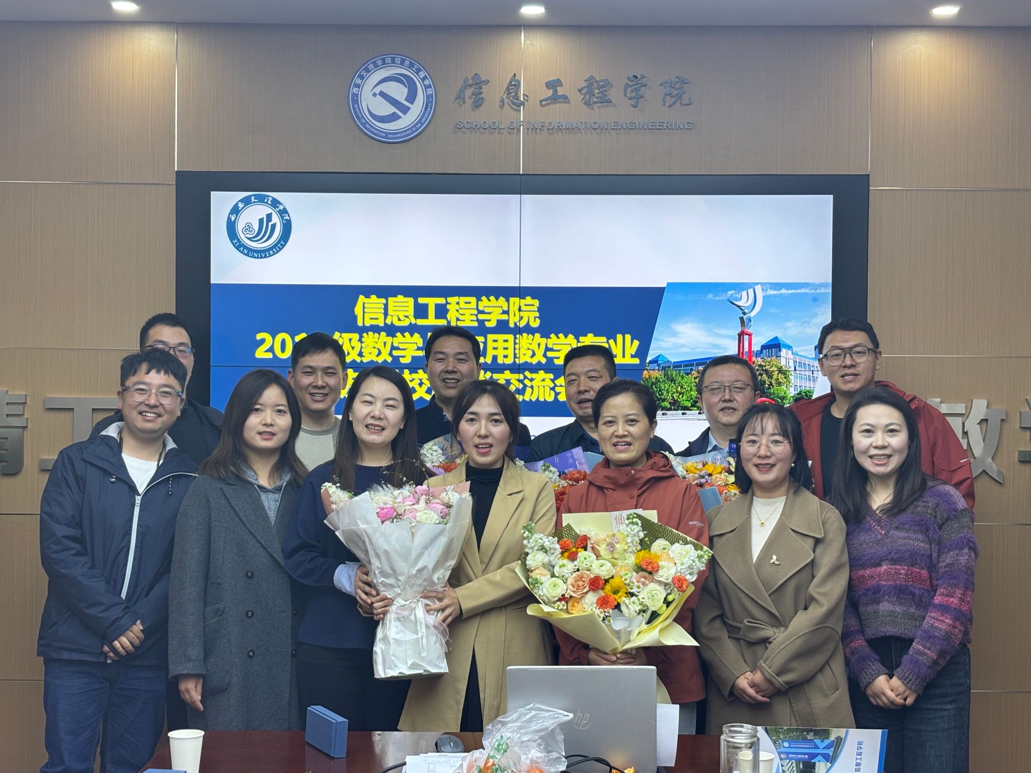 姚力萍向各位校友介绍了与会的领导及老师。校友们向曾经谆谆教诲的老师们汇报了毕业十一年载后各自的发展情况,尤其是那些坚守在数学教育一线的校友们,怀揣着对教育事业的赤诚热爱,向老师们展示了一份份令人骄傲的成绩单,如区级教学能手、市级基本功技能大赛一等奖等荣誉,这些成绩让在座的老师们倍感欣慰。陈广锋向各位校友致欢迎辞并详细介绍了学院近年来的发展现状,对校友们目前所取得的成就表示充分的肯定和赞赏。在座的老师们也分别对校友的到来表示诚挚的欢迎,并希望大家能够邀请更多的同级校友返校,一同关注、参与、支持学院的建设与发展,让信息工程学院这个大家庭更加枝繁叶茂。校友代表向曾经在学习成长道路上给予无私帮助的老师们献花,表达对老师们辛勤培养的感激之情。同时学院领导也为各位校友们赠送了精美的纪念品,承载着学院对校友们的深深祝福和美好期许。