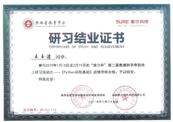 2019年寒假期间,由陕西省教育学会教育统计专业委员会主办、西安索尔软件科技有限公司承办“索尔杯”第二届数据科学寒假线上研习活动之——《Python实战基础》圆满成功。本次活动参与人数涉及128所高校1300余人,提交作业,254份,结业148人,西安文理学院信息工程学院王玉洁和钱迎珊两位同学顺利取得研习结业证书。