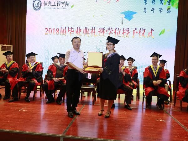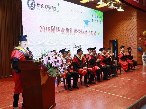 6月28日上午,信息工程学院在明德楼报告厅举行2018届毕业典礼暨学位授予仪式。党政办、教务处、学位研究生管理处、科研处、学生工作处、招就处等职能部门负责人,学院教授、博士及各系室办主任、部分教师代表,2018届毕业生、校友代表以及家长代表等约300人出席典礼。典礼由党总支书记葛翠玲主持,信息工程学院全体领导班子成员参加典礼。