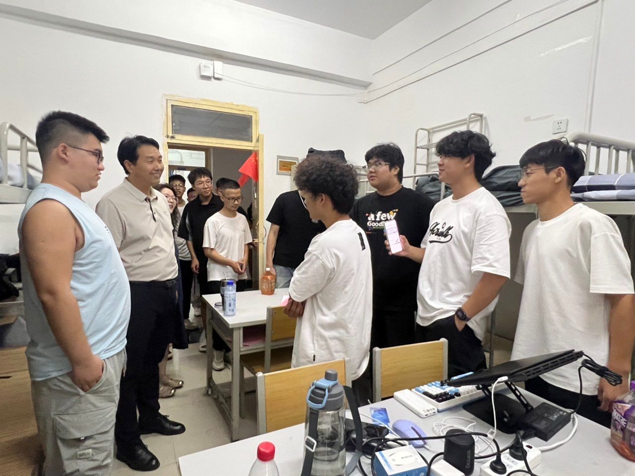 此次走访慰问活动由学院党总支书记王向阳、院长陈广锋亲自带队,各系主任、辅导员等共同参与,按照新生宿舍分布情况,分区域、分楼栋开展全覆盖走访。每到一间宿舍,领导老师们都主动与新生亲切交流,仔细查看宿舍的居住环境、设施配备情况,询问新生是否适应宿舍生活、饮食是否习惯、行李物品是否齐全,耐心倾听新生在入住过程中遇到的困难与需求。在走访过程中,陈广锋院长亲切地与新生们拉起家常,他鼓励新生们要尽快调整心态,适应大学的集体生活,多与室友沟通交流,相互帮助、共同进步,同时叮嘱大家要注意宿舍用电安全、消防安全,养成良好的作息习惯,以饱满的精神状态迎接即将到来的大学生活。党总支书记王向阳则重点关注新生的心理适应情况,他告诉新生们,学院是大家在大学的“第二个家”,无论是学习上的困惑还是生活中的难题,都可以随时向老师、辅导员求助,学院会全力为大家的成长保驾护航。作为与新生日常联系最紧密的“贴心人”,学院全体学工队伍在走访过程中充分发挥服务职能,为新生提供全方位的帮助与指导。