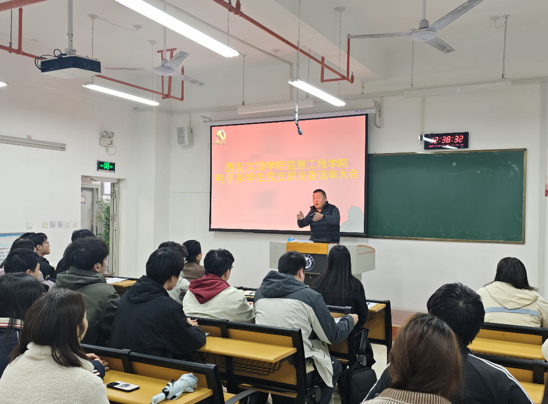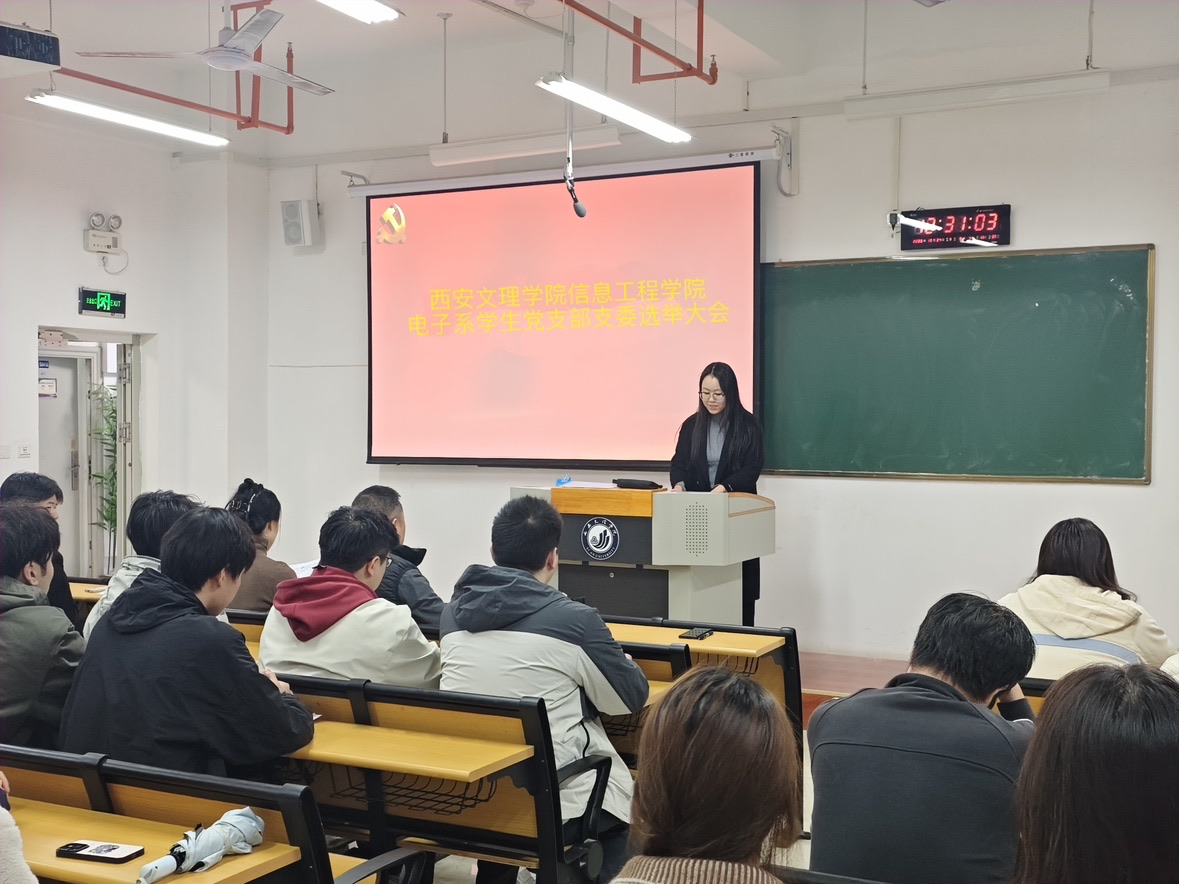 会议第二部分:电子系学生党支部支委选举。(学院党建专责张亚茹同志宣读《中共西安文理学院信息工程学院电子系学生支部支委选举办法》明确了选举的流程与规则。)