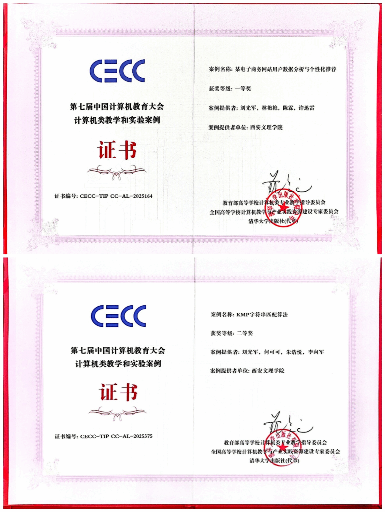 信息工程学院刘光军教授团队向大会提交的两项计算机类教学和实验案例“KMP字符串匹配算法”“某电子商务网站用户数据分析与个性化推荐”分别荣获一等奖和二等奖。案例以其先进的教学思想和实用的案例设计,赢得了与会评审专家的高度评价和认可。