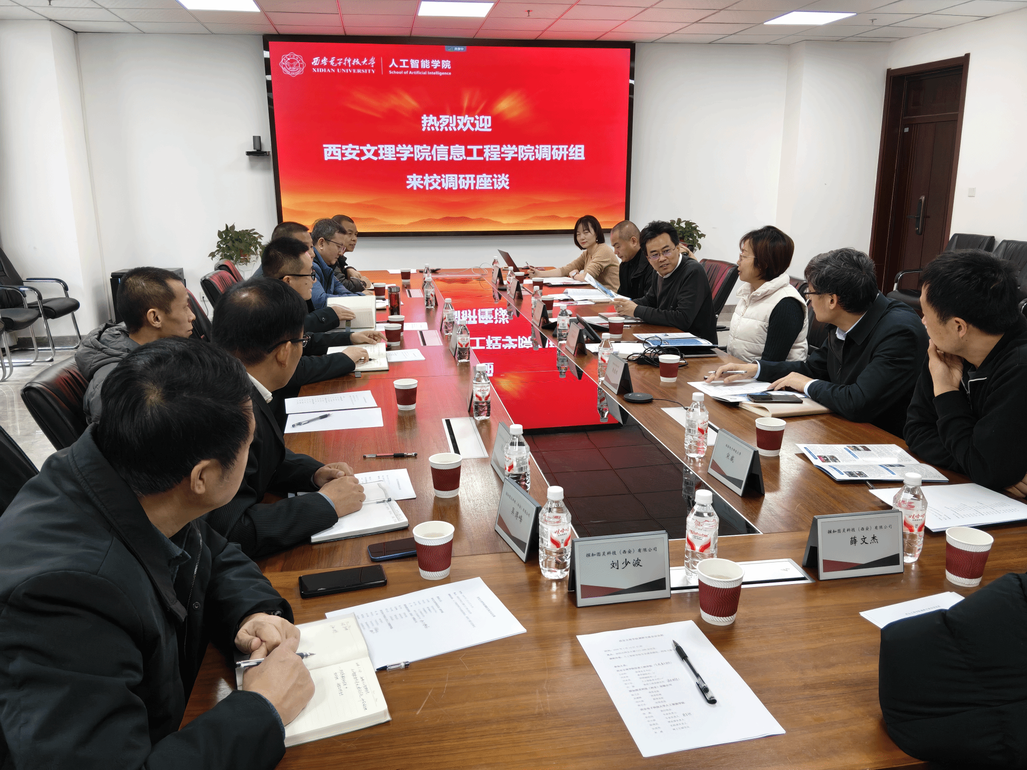 首先,人工智能学院执行院长侯彪教授详细介绍了学院发展历史和学科建设成就。随后,双方就博士人才引进、人工智能通识教育和专业建设、师资团队建设等议题进行深入探讨与交流。探知图灵科技(西安)有限公司代表一同参会并参与交流。