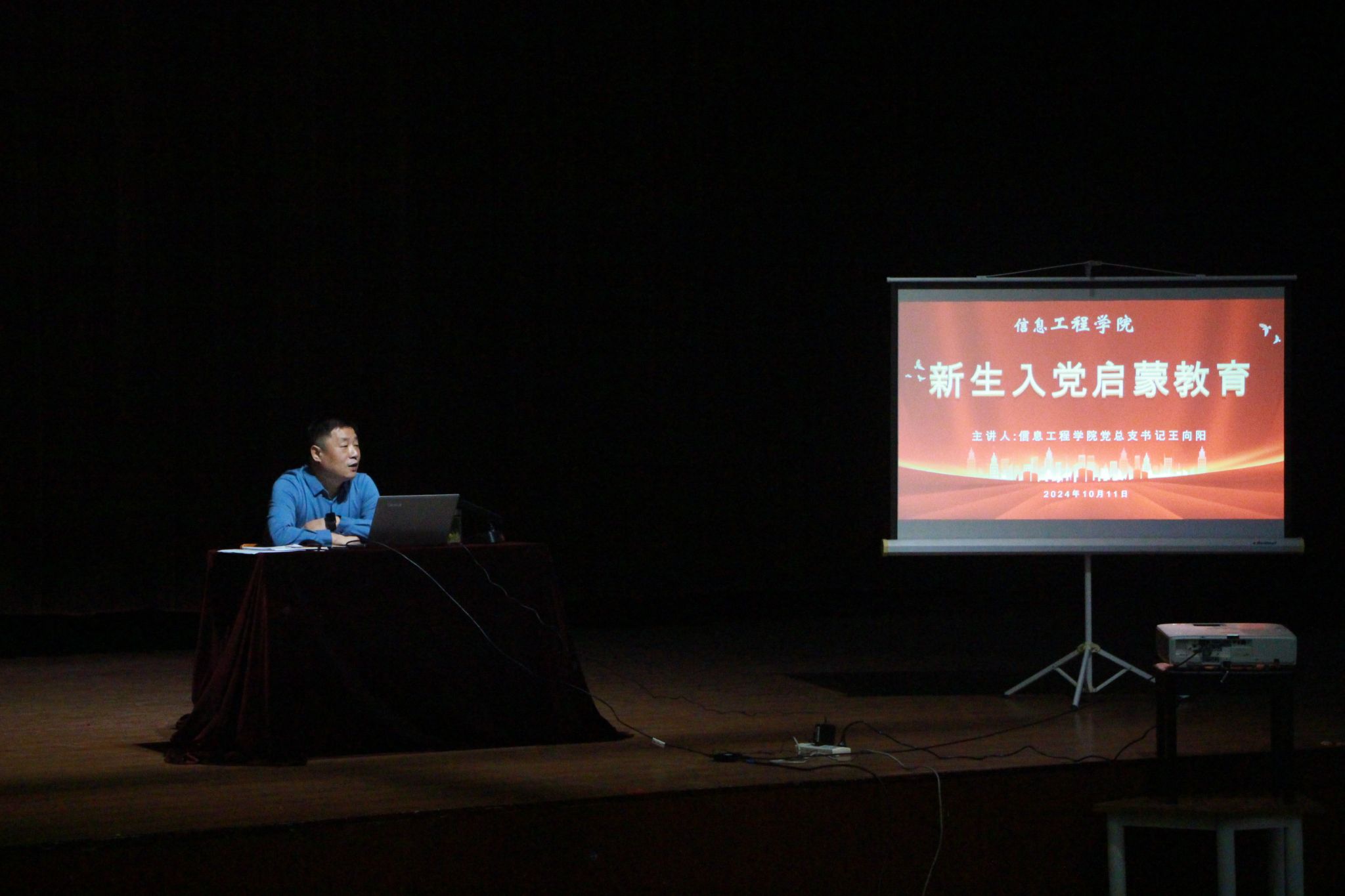 信息工程学院党总支书记王向阳面向2024级新生从党的基本知识、为什么要入党、入党的程序和路径、怎么实现入党四个方面对入党进行了详细的讲解。他强调,一代人有一代人的使命,一代人有一代人的担当,共青团员要勇于亮身份、作表率。同时,对大家提出三点期望,一是要养成良好的生活习惯学习习惯,二是要提高自身自主学习能力,三是要坚定理想信念,提高思想觉悟。