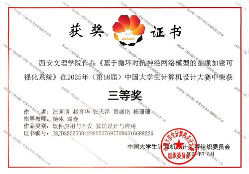 2025年7月30日,第十八届中国大学生计算机设计大赛全国总决赛在山东泰安落下帷幕。信息工程学院2022级计算机科学与技术专业学子凭借卓越的专业技能与创新精神,从全国769件“软件应用与开发—算法设计与应用”赛道中脱颖而出,其作品《基于循环对抗神经网络模型的图像加密可视化系统》,荣获软件应用与开发类国家级三等奖,标志着学院在交叉学科创新人才培养领域取得突破性进展。