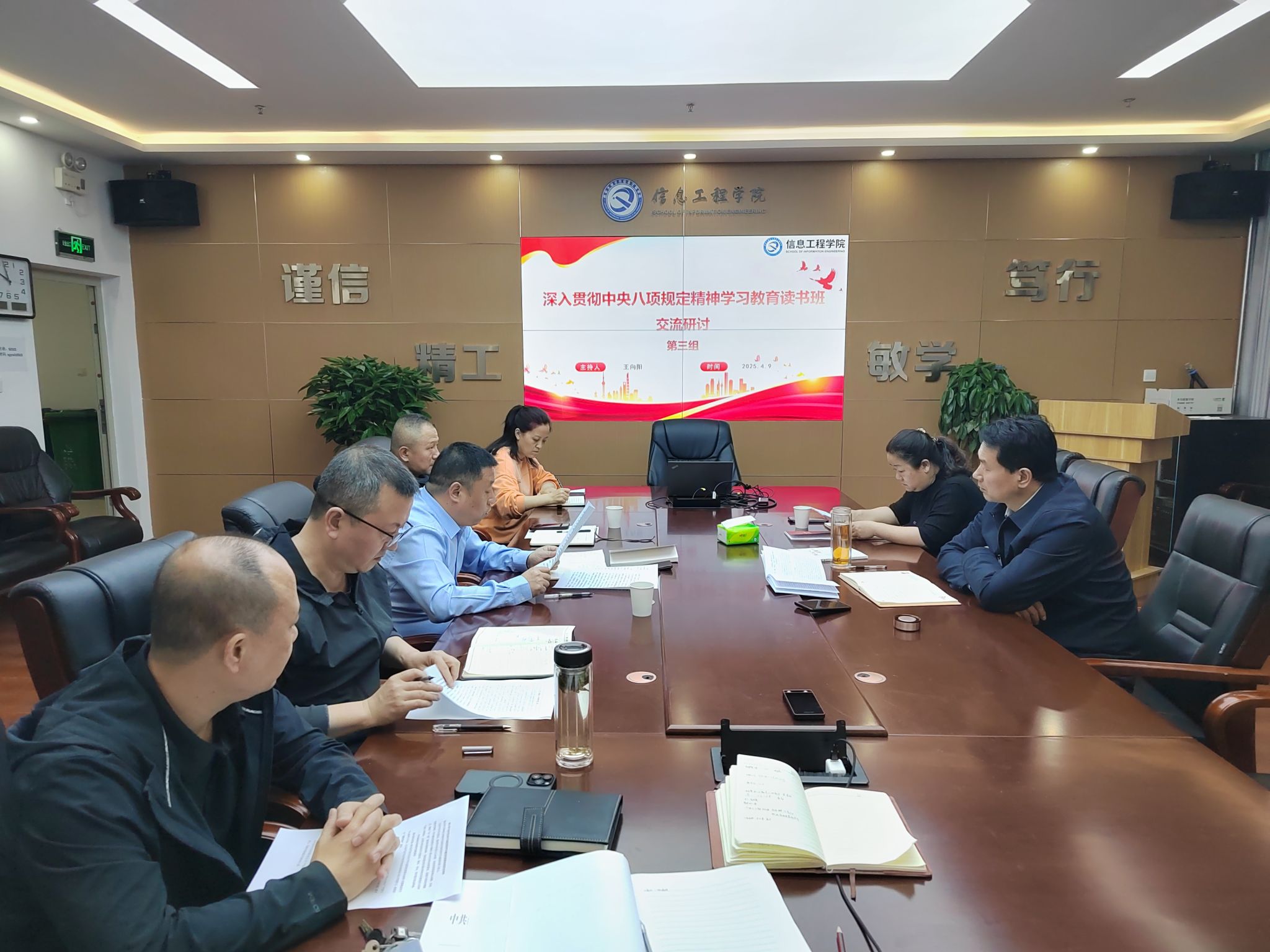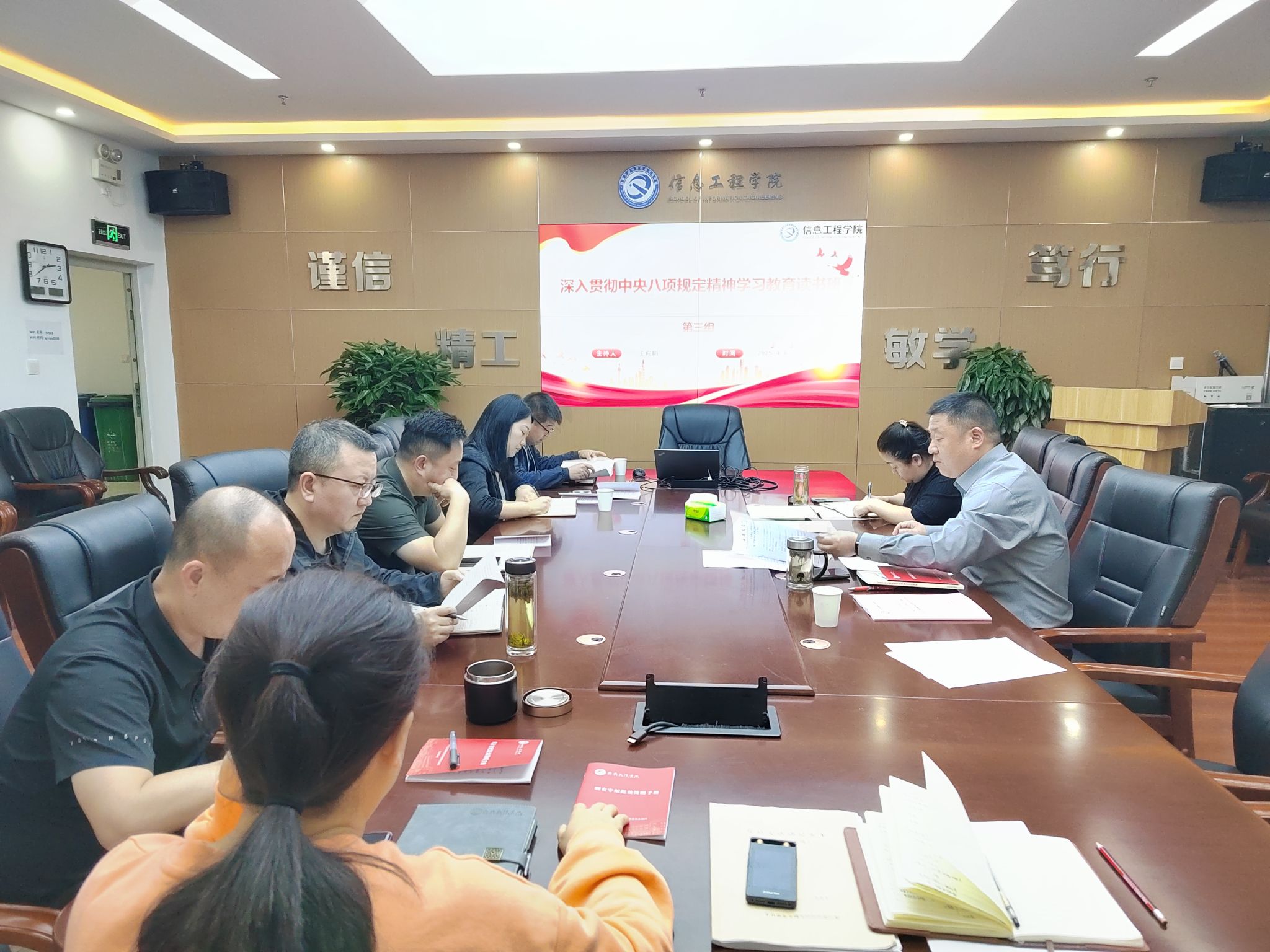 为深入学习贯彻习近平总书记关于加强党的作风建设的重要论述,锲而不舍落实中央八项规定及其实施细则精神,落实校党委深入贯彻中央八项规定精神学习教育读书班工作方案,4月8日至4月10日,第三组读书班于行知楼S0503开展学习,信息工程学院党总支书记王向阳主持会议,信息工程学院、国资处、招就处处级干部参加学习,校务委员徐东升列席指导工作。