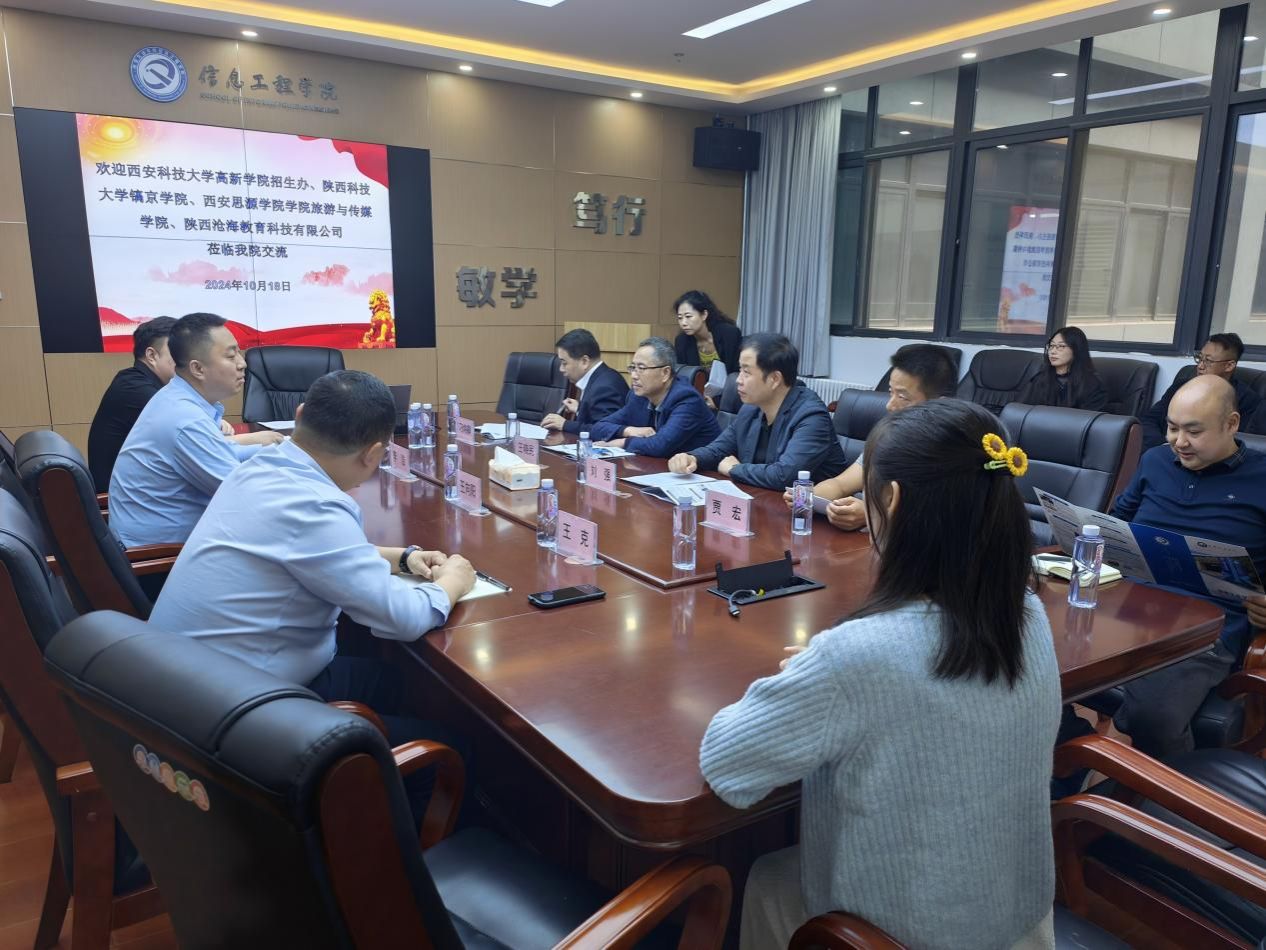 10月18日,陕西科技大学镐京学院副校长王晓民、西安科技大学高新学院招生办主任刘强、西安思源学院旅游与传媒学院党总支书记刁炜卿、陕西沧海教育科技有限公司董事长贾宏一行15人,由王晓民副校长带队,赴信息工程学院对数字产业学院(筹)的建设工作开展调研。信息工程学院党总支书记王向阳、副院长李浩进行了接待。