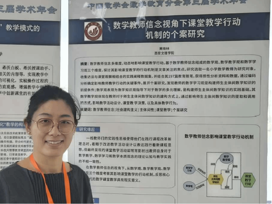 于鸿丽教授做了题为《“学--评”一体化师范生实践能力培养模式的探索与实践》的报告,分享了在师范生实践能力培养方面的成果和经验。黄晓林博士通过海报展览方式交流了关于“数学教师信念视角下教师课堂教学行动机制”的阶段性研究成果。